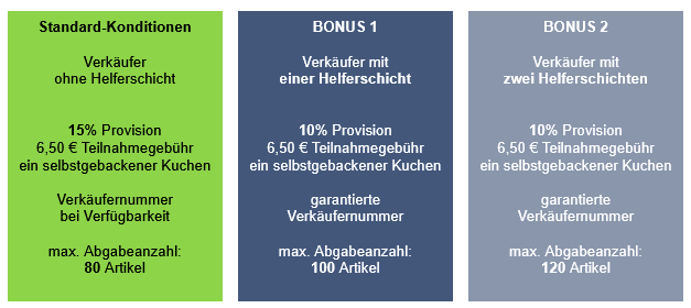 Die Teilnahmegebühr fällt auch an, wenn keine Ware verkauft wurde oder ein angemeldeter Verkäufer nicht zum Basar-Termin erscheint.